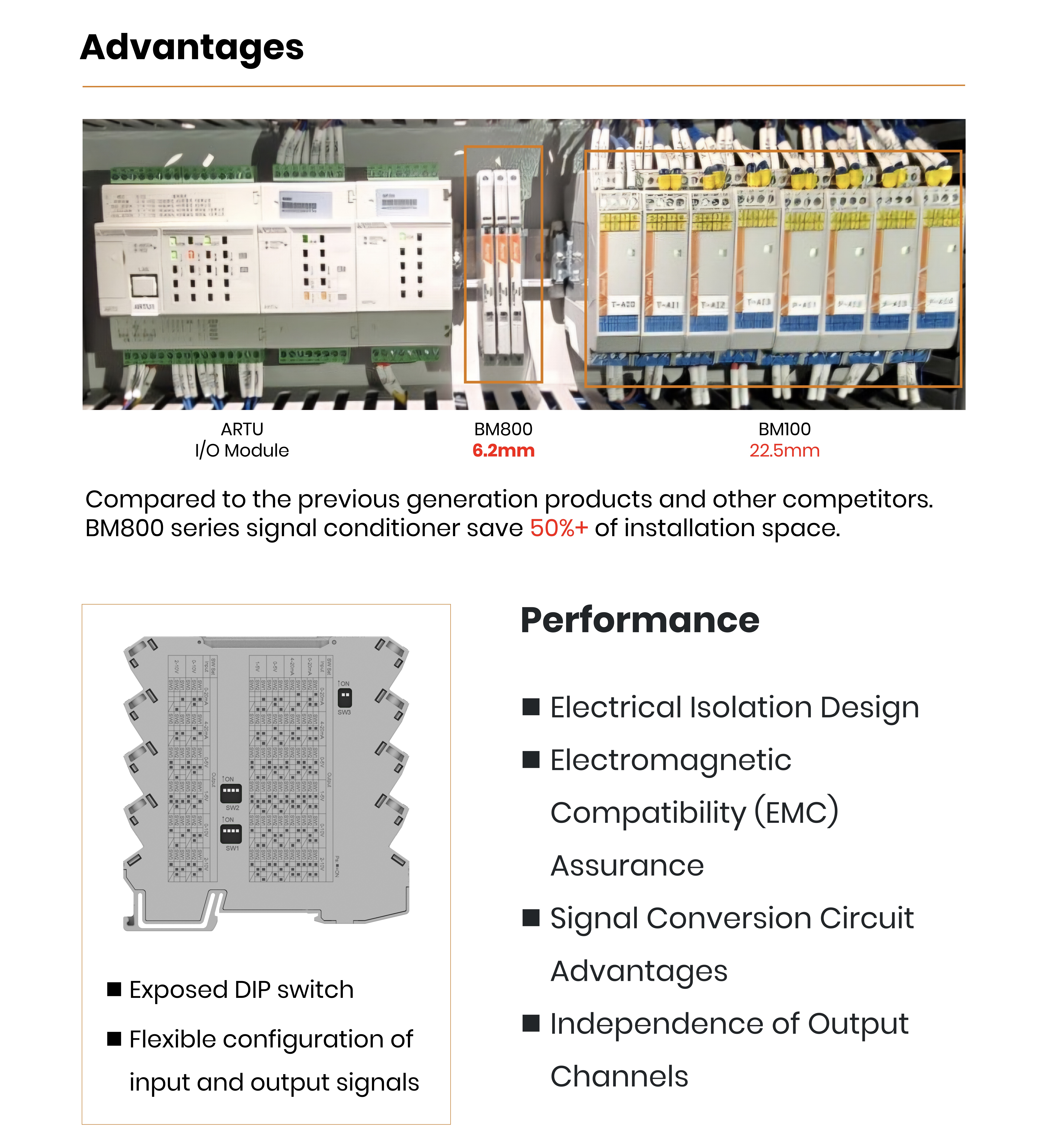 Kondycjoner sygnału serii BM800, znany również jako izolatory sygnału, konwertery sygnału i przetworniki sygnału, to zaawansowane przemysłowe urządzenie do kondycjonowania sygnału o super cienkiej konstrukcji o grubości 6,2 mm, oszczędzające ponad 50% przestrzeni instalacyjnej. Charakteryzuje się dokładnością 0,1%, gwarancją kompatybilności elektromagnetycznej i takimi funkcjami, jak izolacja galwaniczna, zalety obwodu konwersji sygnału i niezależne kanały wyjściowe. Dzięki przełącznikowi DIP umożliwiającemu elastyczną konfigurację sygnału wejściowego i wyjściowego może przetwarzać różne sygnały, takie jak 0/4 ~ 20 mA, 0/1 ~ 5 V itp. Charakteryzuje się również doskonałą wydajnością w zakresie dryfu temperatury, czasu reakcji i wytrzymałości izolacji.