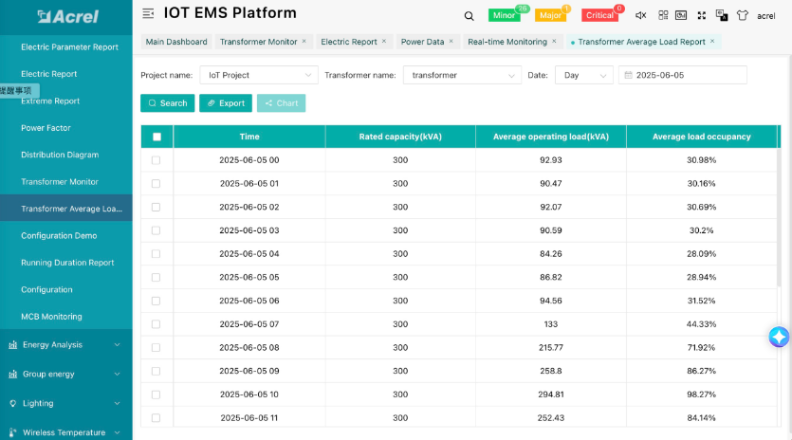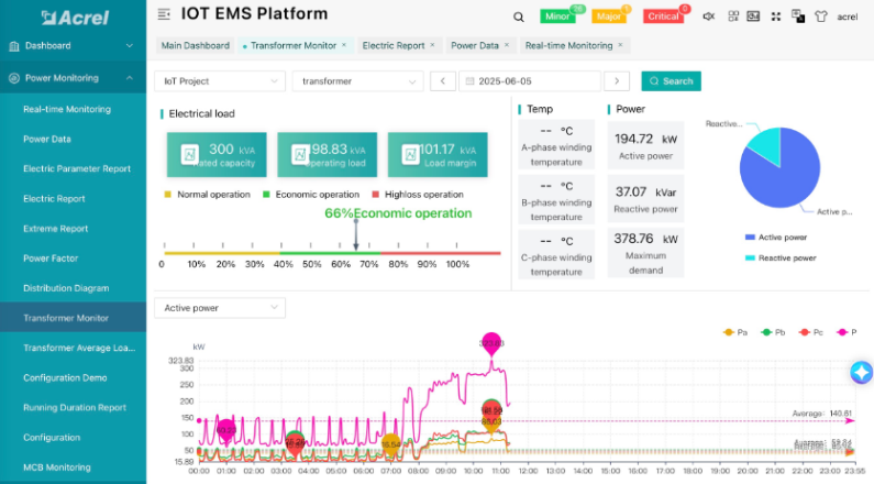 2. Wizualizacja pracy transformatora: Platforma stale monitoruje parametry krytyczne (prąd, napięcie, współczynnik mocy itp.), zapewniając pracę transformatorów w bezpiecznych granicach obciążenia i zmniejszając ryzyko przeciążenia i uszkodzenia.
